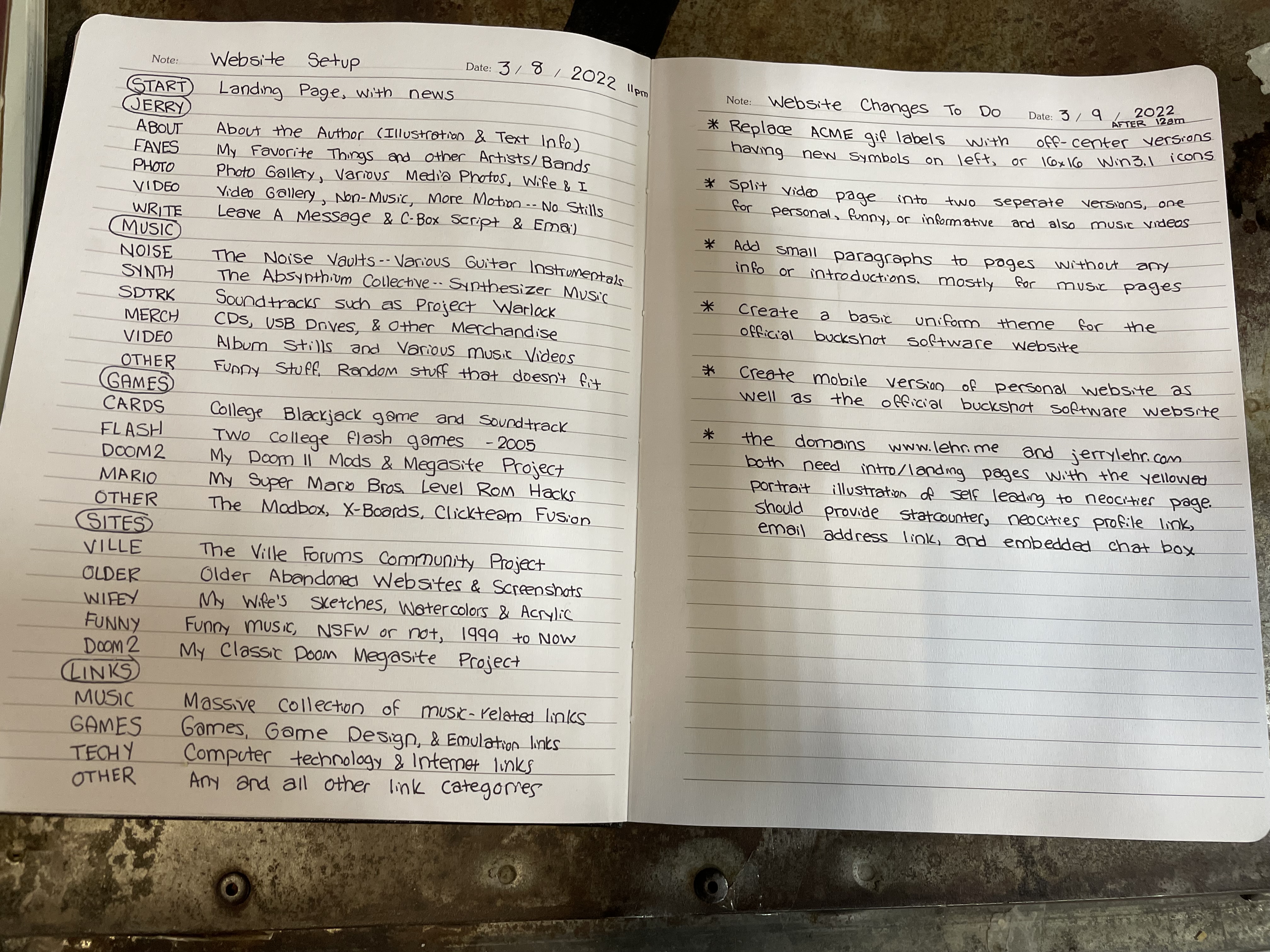 These journals as well as my larger more normal looking journals house notes, ideas, music plans, lyrics, web design, game ideas, reminders, doom levels, work notes, and completely off the wall random stuff sometimes. Since I really don't feel like travelling out to the garage right now that second screenshot should be a good enough representation of the 147 other pocket journals.