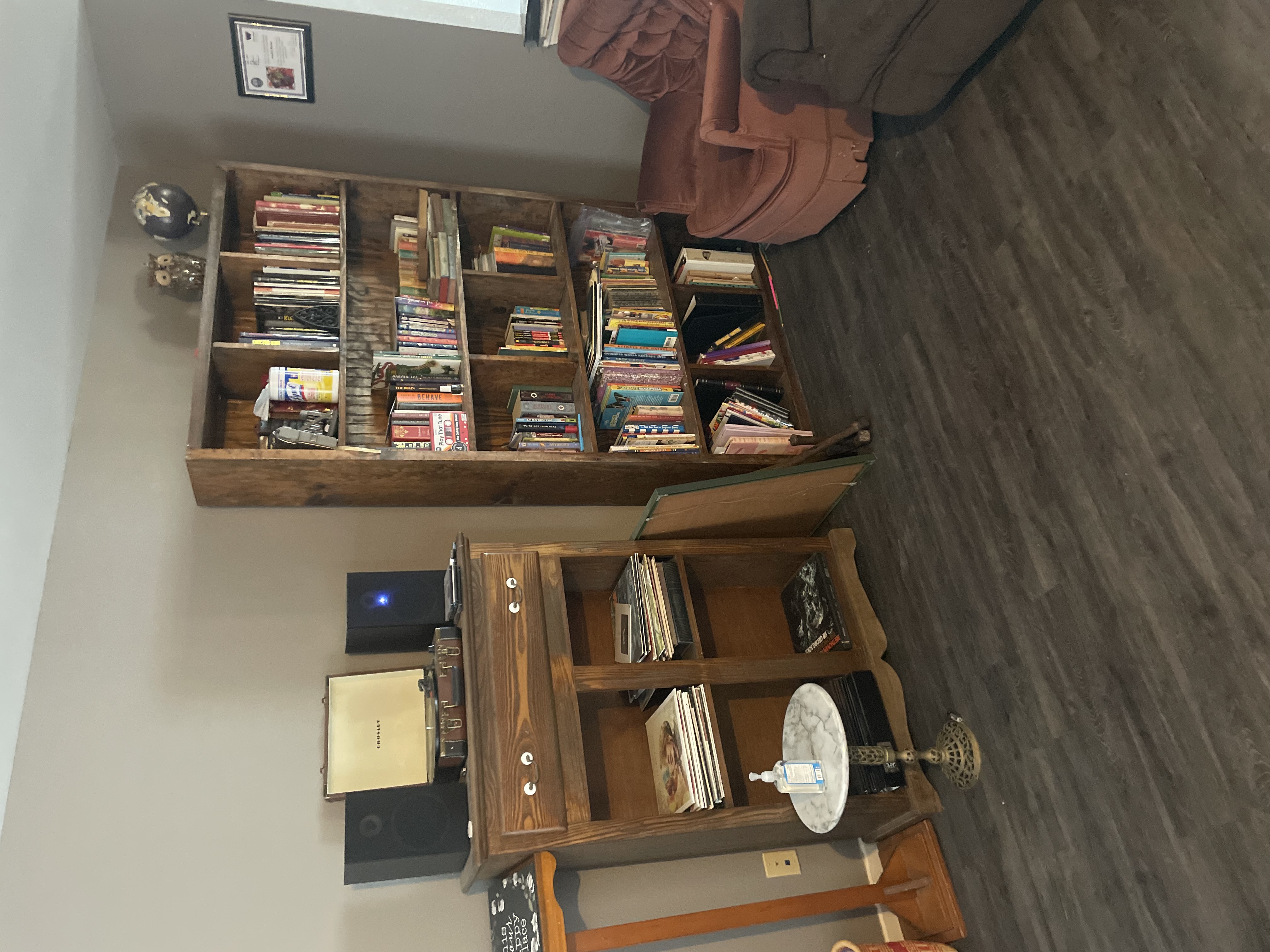 RECORD PLAYER AND HANDMADE LIBRARY SHELF